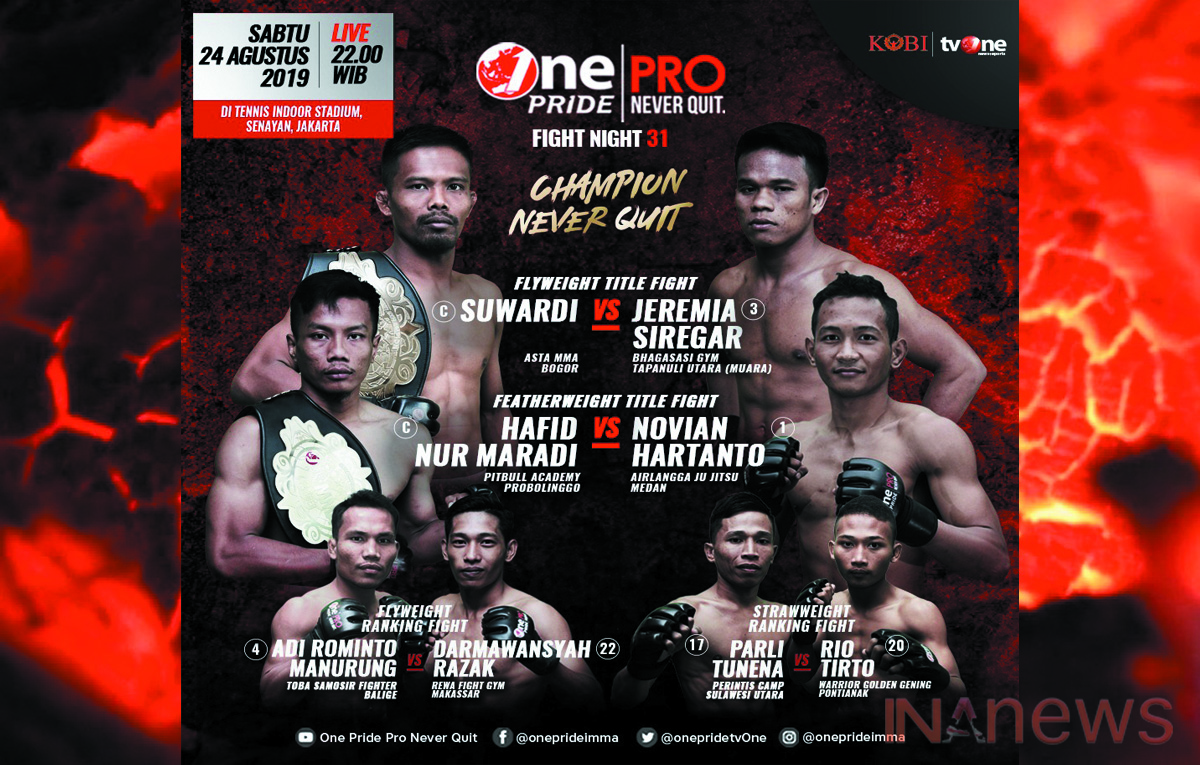 Dengan Mengusung tema “Champion Never Quit” Fight Night 31 nanti akan menyajikan 4 pertandingan MMA Nasional, termasuk perebutan 2 Sabuk Juara Nasional MMA One Pride di kelas Flyweight dan Featherweight.