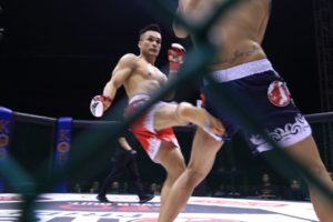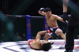 Randy Pangalila mengalahkan Adhi Pawitra dengan TKO (low kick) pada 3:49 di Ronde 1