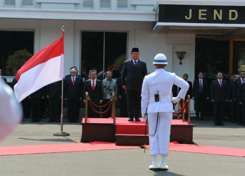 Menhan Prabowo Subianto datang ke kantor Kementerian Pertahanan guna melaksanakan prosesi Upacara Serah Terima Jabatan dengan Ryamizard Ryacudu selaku pejabat Menhan pada Periode Kabinet Kerja Masa Bhakti 2014-2019.