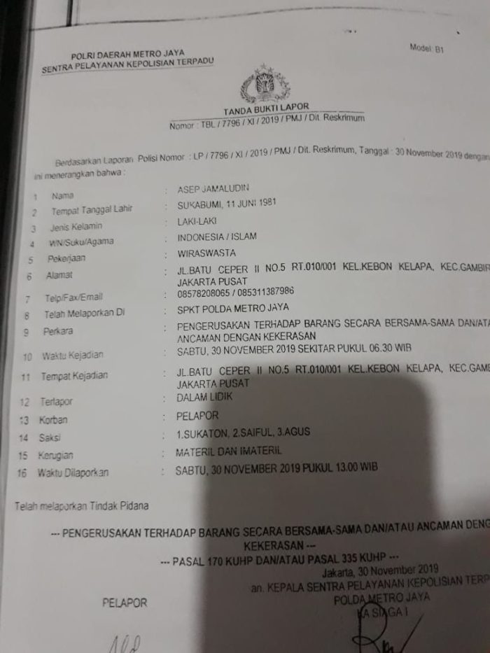 Laporan Asep Jamaludin kepada Polisi terkait pengrusakan dan intimidasi