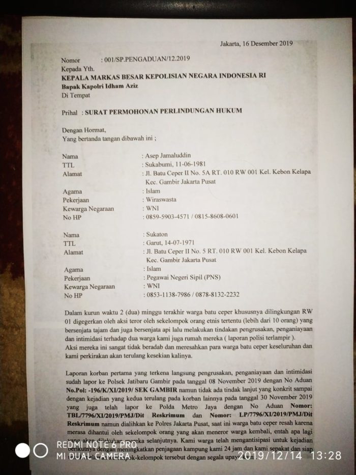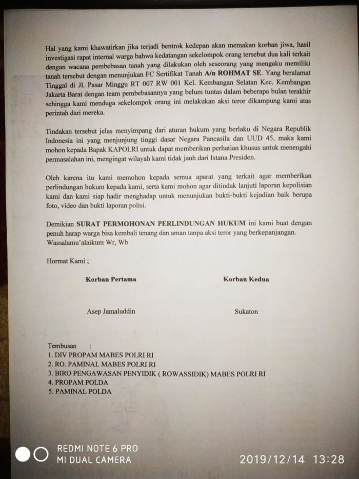 Asep dan warga juga sudah meminta dan berkirim surat minta perlindungan hukum kepada Presiden dan Kapolri yang isinya sebagai berikut: