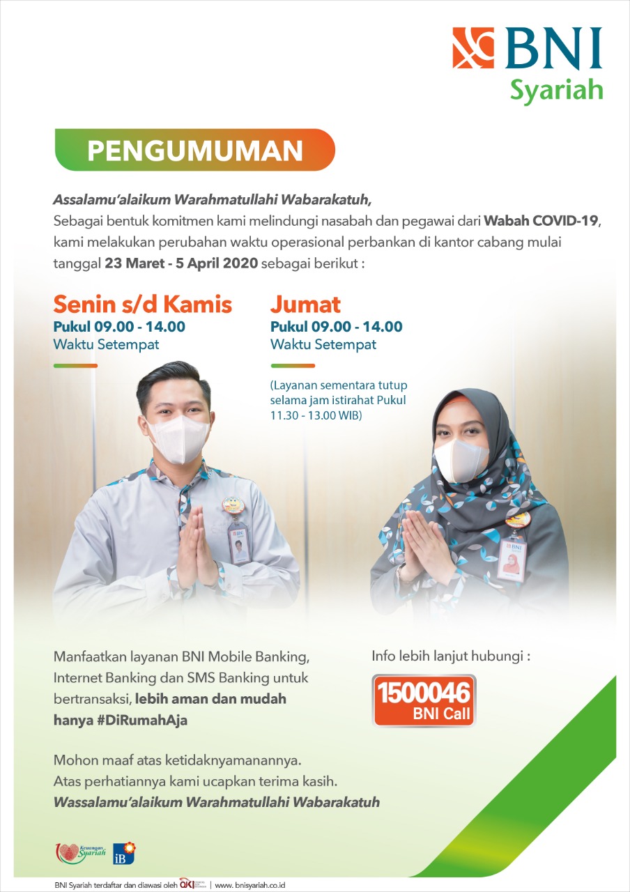 Terkait virus corona, BNI Syariah melakukan perubahan waktu operasional di kantor cabang mulai 23 Maret 2020 – 3 April 2020.