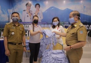 Secara simbolis Walikota Bitung Max J Lomban menyerahkan masker, hand sanitizer dan alat pelindung wajah, kepada Ketua TP. PKK yang ada di 8 Kecamatan dan disaksikan oleh kepala Kecamatan se – kota Bitung.