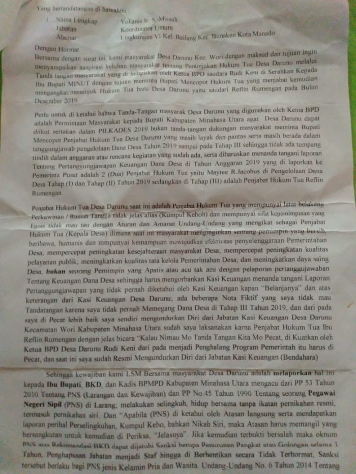 “Seharusnya tanda tangan tersebut untuk diikutsertakannya Desa Darunu dalam Pilkades 2019 kepada Bupati Minahasa Utara , bukan lampiran tanda tangan dukungan untuk mencopot Plt Hukum Tua yang menjabat,” ujar Stecman J.N .Zala , warga Desa pada 17 mei 2020 , kepada INAnews.