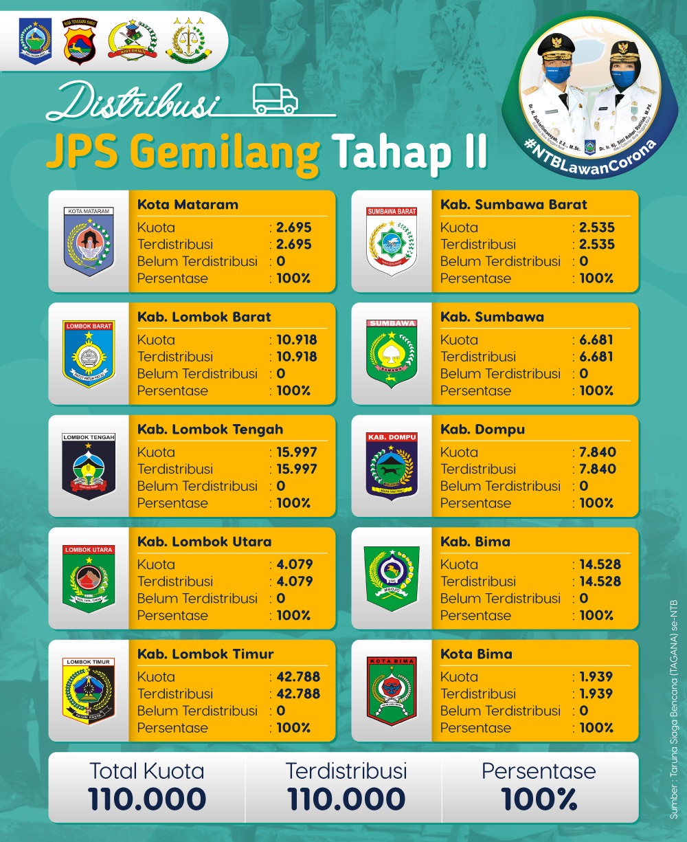 “Penyaluran JPS Gemilang Tahap II bagi masyarakat terdampak akibat COVID-19 sudah tuntas pada Rabu (17/6) lalu. Alhamdulillah, ini semua berkat kekompakan bersama yang luar biasa, sehingga distribusi terbilang cepat dan lancar di 10 kabupaten/kota,” kata Kepala Biro Humas dan Protokol Setda Provinsi NTB, Najamuddin Amy, S.Sos, MM Jum’at (19/6/2020) di Mataram.