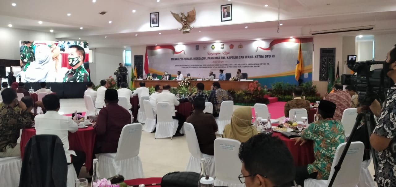 Dihadapan Menko Polhukam, Mendagri, Panglima TNI, Kapolri dan Wakil Ketua DPD RI, Gubernur NTB, H Zulkieflimansyah menyampaikan beberapa laporan. Salah satunya soal perkembangan/keadaan NTB dimasa pandemi corona virus.