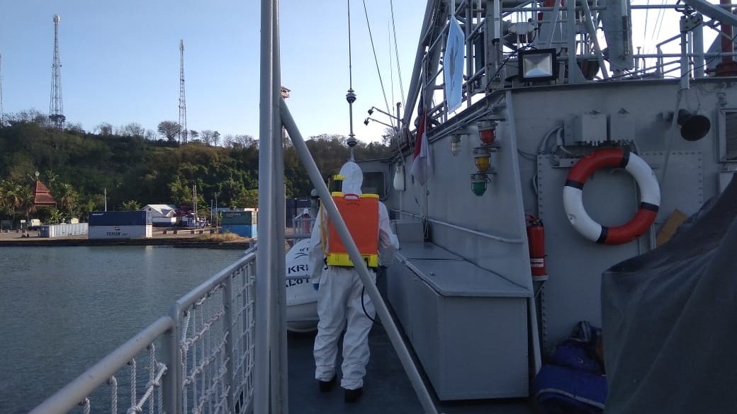 Disampaikan Danlanal Mataram, Disinfeksi dan Thermal Screening di KRI (Kapal Republik Indonesia) merupakan salah satu tindakan preventif untuk mencegah penyebaran wabah virus Corana.