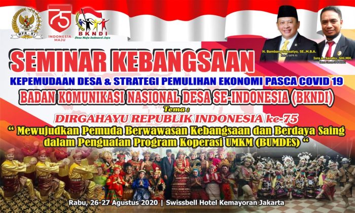 Inilah yang menjadi dasar dihelatnya ‘Seminar Kebangsaan Kepemudaan Desa & Strategi Pemulihan Ekonomi Pasca Covid-19’ oleh Dewan Pengurus Nasional Badan Komunikasi Nasional Desa Se-Indonesia (DPN BKNDI) dengan tema “Dirgahayu Republik Indonesia Ke 75, Mewujudkan Pemuda Berwawasan Kebangsaan dan Berdaya Saing dalam Penguatan Program Koperasi UMKM (BUMDes)”. Dan sebagai penguat dari empat pilar, seminar kebangsaan ini akan dibuka langsung oleh Ketua MPR RI.
