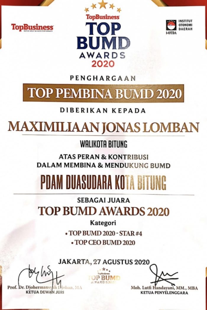 MJL kali ini dinobatkan sebagai Top Pembina BUMD 2020, MJL sendiri dianggap berhasil atas peran dan kontribusi membina BUMD PDAM Duasudara Kota Bitung sebagai juara Top BUMD Awards 2020 dengan kategori Top BUMD 2020-Stars #4 dan Top Ceo BUMD 2020.