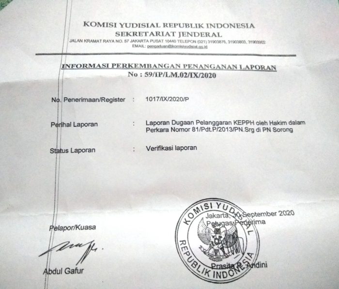 Atas laporan Abdul Gafur , tim verifikasi KY juga menjawab surat dengan nomor penerimaan/register ; 1017/IX/2020/P dengan status verifikasi laporan.