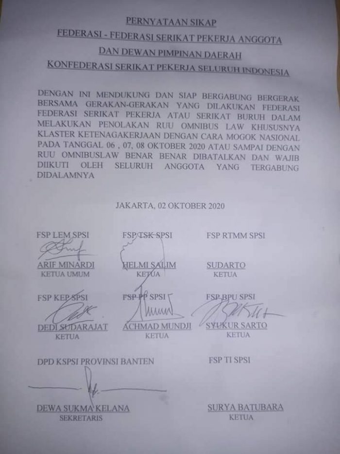 “Dalam mogok nasional nanti, kami akan menghentikan proses produksi. Di mana para buruh akan keluar dari lokasi produksi dan berkumpul di lokasi yang ditentukan masing-masing serikat pekerja di tingkat perusahaan,” ujar Said Iqbal dalam siaran rilisnya 28 september 2020.