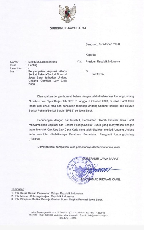 Sehubungan dengan hal tersebut, Pemerintah Daerah Provinsi Jawa Barat menyampaikan Aspirasi dari Serikat Pekerja/Serikat Buruh yang menyatakan dengan tegas Menolak Omnibus Law Cipta Kerja yang telah disahkan menjadi Undang-Undang serta meminta diterbitkannya Peraturan Pemerintah Pengganti Undang- Undang (PERPU).