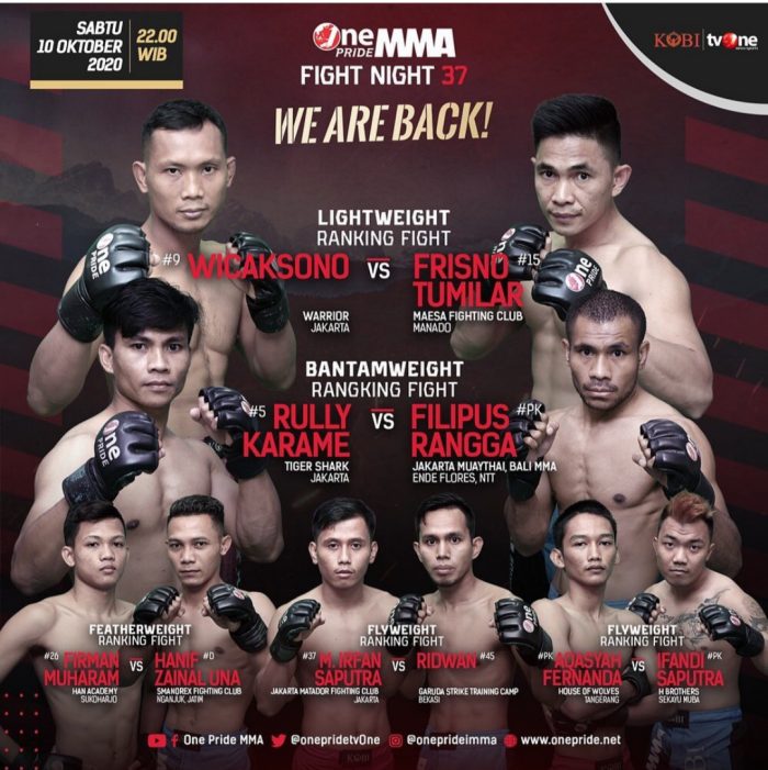 Fighter asal Jakarta Wicaksono akan naik ke One Pride Arena menghadapi Frisno Tumilar di partai perbaikan peringkat kelas Lightweight. Pertarungan perbaikan peringkat kelas Featherweight akan dihadapi Firman Muharram melawan Hanif Zainal Una.