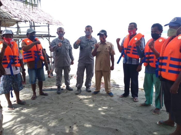 Diakhir pembekalannya, Laksma Bakamla Arif Sumartono membagikan life jacket Bakamla kepada nelayan.