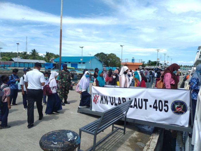 INAnews.co.id, Halmahera – KN Ular Laut-405 Bakamla RI yang sedang bersandar di pelabuhan Laut Laiwui Jikotamo, Halmahera Selatan, menerima kunjungan 20 Siswa Taman Kanak-Kanak Paud Gerbang Mas Obi, 60 Siswa Sekolah Menengah Pertama Almarif Jikotamo dan 70 Siswa MTS Arahman Jikotamo, Kamis (12/11/20).