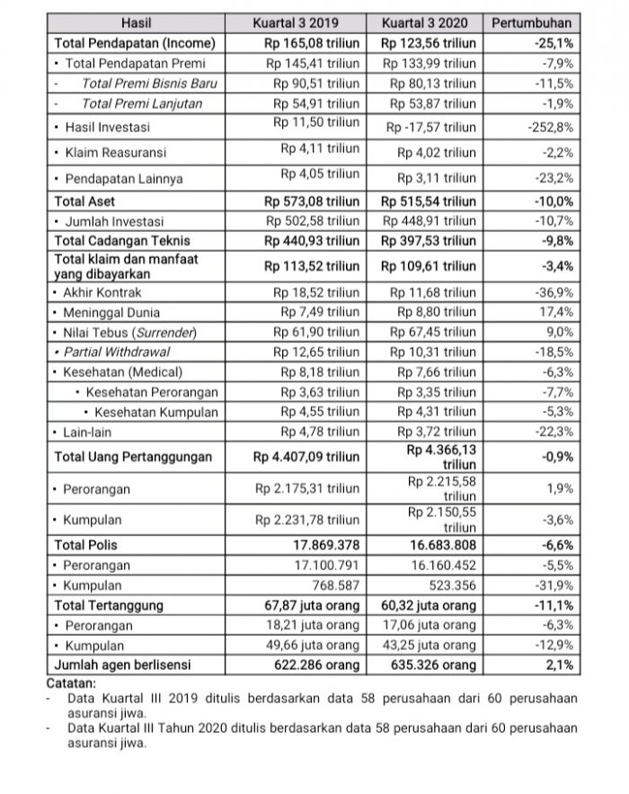 Perlambatan pada industri jiwa di Kuartal III Tahun 2020 tercatat sebesar 25,1% pada Total Pendapatan, yaitu dari Rp 165,08 triliun di Kuartal III 2019 menjadi Rp 123,56 triliun di Kuartal III Tahun 2020. Sebagai bagian dari Total Pendapatan, Total Premi melambat sebesar 7,9% dari Rp 145,41 triliun menjadi Rp 133,99 triliun di Kuartal III Tahun 2020. Dari Total Premi, Total Premi Bisnis Baru melambat sebesar 11,5% dari Rp 90,51 triliun menjadi Rp 80,13 triliun. Sementara itu Total Premi Lanjutan melambat sebesar 1,9% dari Rp 54,91 triliun menjadi Rp 53,87 triliun.