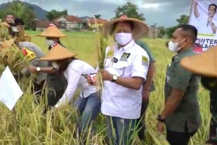 INAnews.co.id, Cianjur – Ketua MPR RI Bambang Soesatyo bersama Gabungan Kelompok Tani (Gapoktan) Mekar Makmur dan Gerakan Keadilan Bangun Solidaritas (GERAK BS) melakukan panen raya padi di Desa Mekarsari, Cianjur, Jawa Barat.