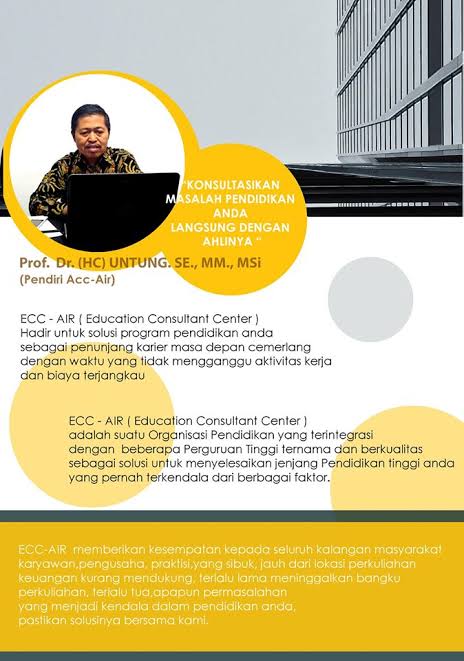 Pendiri ECC Air Prof.Dr(HC) Untung, SE,MM,Msi saat ditemui Redaksi INAnews di Kampus ECC Air , Gunung Sindur , Bogor, mengatakan jika lembaganya tersebut siap mendampingi dan memberikan solusi pendidikan kepada siapa saja yang ingin meraih sarjana namun terbatas waktu dan pekerjaan.