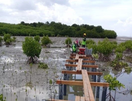 Program rehabilitasi ini tak berhenti di penanaman saja tapi akan berlanjut pada pembangunan tracking mangrove sepanjang 726 meter dengan melibatkan 4 kelompok penggiat mangrove yang tersebar di masing-masing lokasi tracking mangrove seperti Lampung Timur, Serang, Rembang dan Pati.