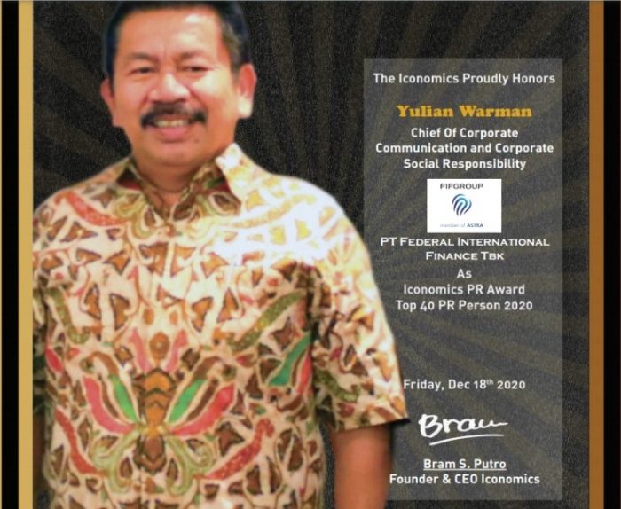 Dalam kesempatan yang berbahagia kali ini, Iconomics Indonesia Top 40 PR Persons Award 2020 memberikan penghargaan kepada Chief Of Corporate Communication and Corporate Social Responsibility FIFGROUP, Yulian Warman sebagai “Iconomics Indonesia Top 40 PR Persons Award 2020” yang diwakili oleh Corporate Communication Sub Department Head Charles DW Simaremare.