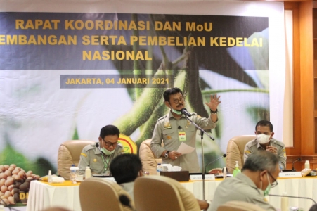 “Kondisi ini menyebabkan pengembangan kedelai oleh petani sulit dilakukan. Petani lebih memilih untuk menanam komoditas lain yang punya kepastian pasar. Tapi kami terus mendorong petani untuk melakukan budidaya. Program aksi nyatanya kami susun dan yang terpenting hingga implementasinya di lapangan,” demikian penekanan Menteri Pertanian Syahrul Yasin Limpo (Mentan SYL) usai Rapat Koordinasi dan MoU pengembangan serta pembelian kedelai nasional di Kantor Direktorat Jenderal Tanaman Pangan, Jakarta, Senin (4/1/21).