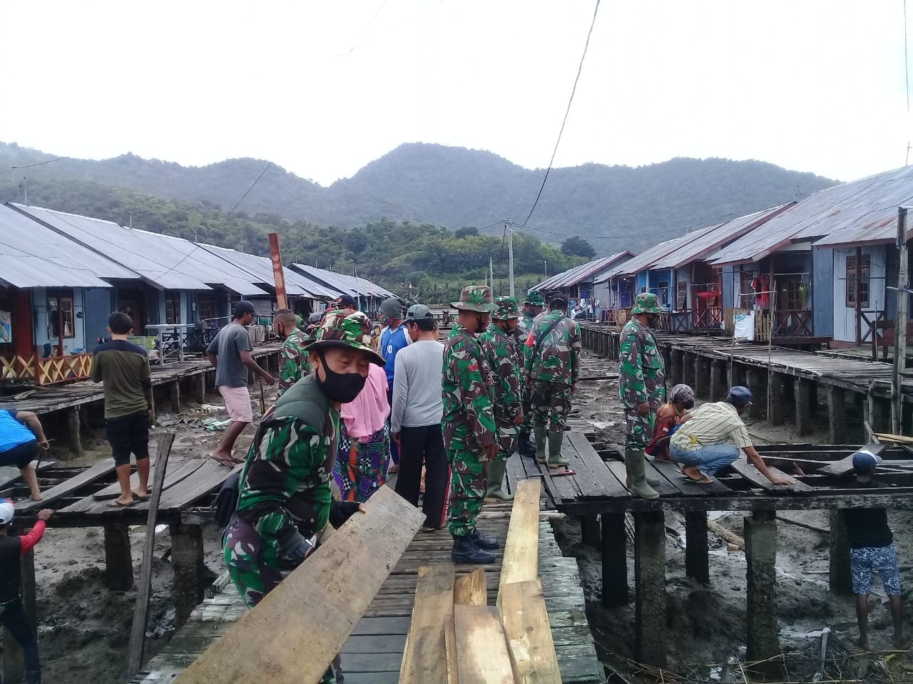 Kodim 1628/SB Bersama Masyarakat Gotong Royong, Bantu Perbaiki Jalan Rumah Apung Dan Imbau Sop Protokol Covid -19 Perbesar