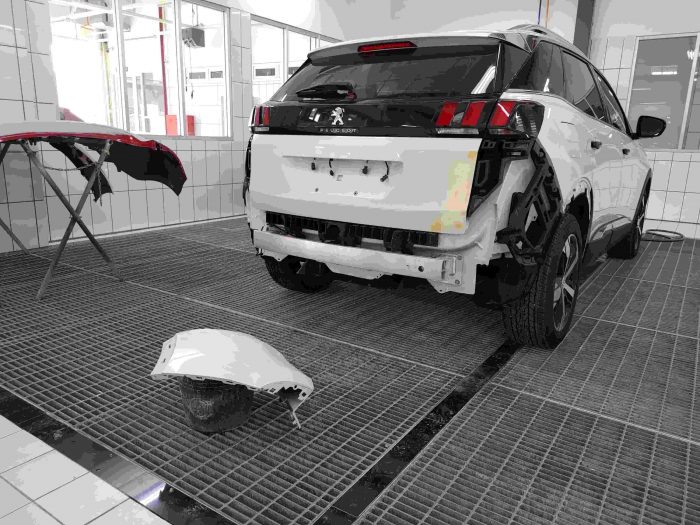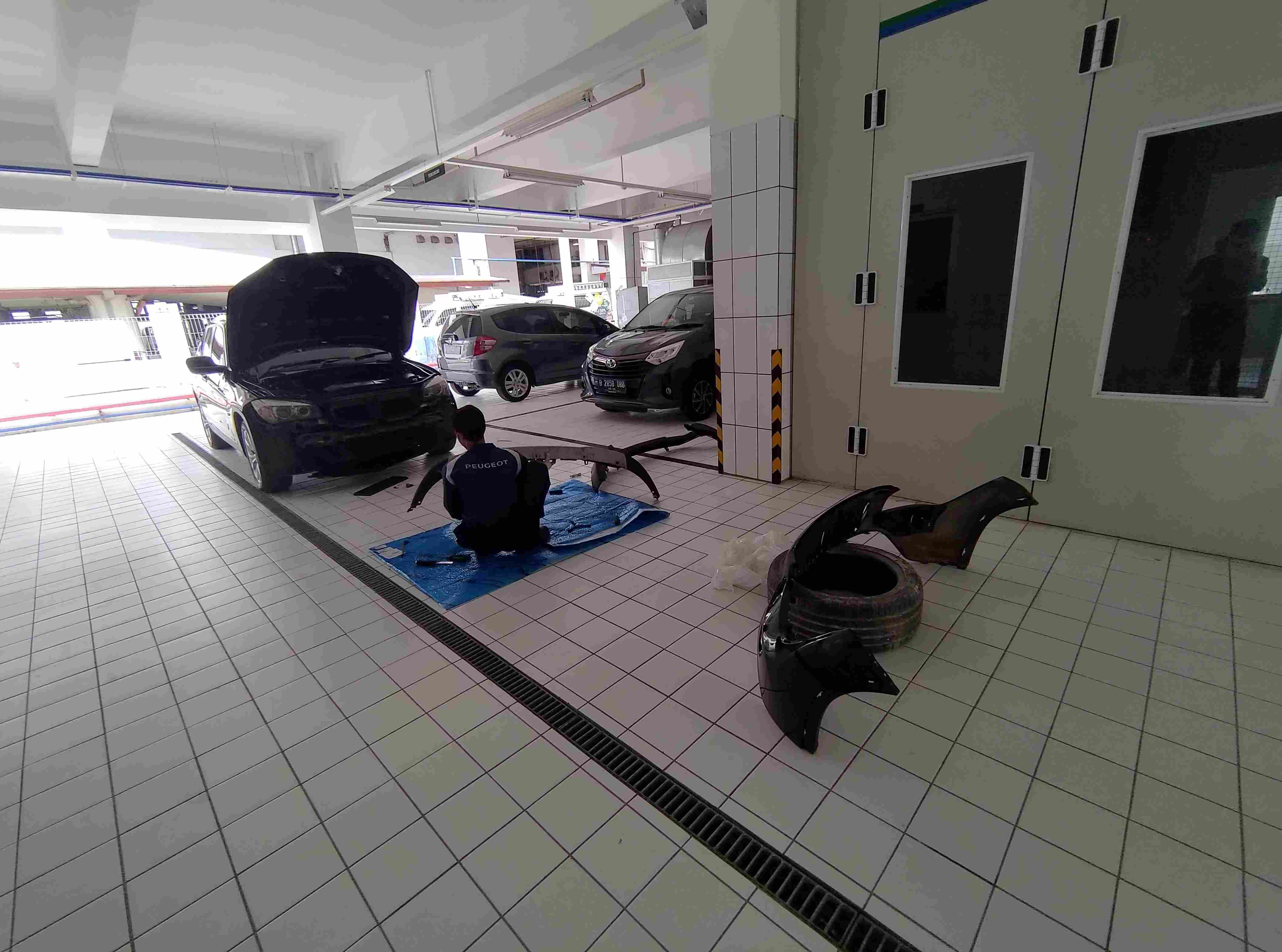 Layout Bengkel Body Repair disetting sedemikan rupa untuk memudahkan pelayanan. Berada di area Dealer dan Bengkel Astra Peugeot, layanan ini terintegrasi satu dengan lainnya.