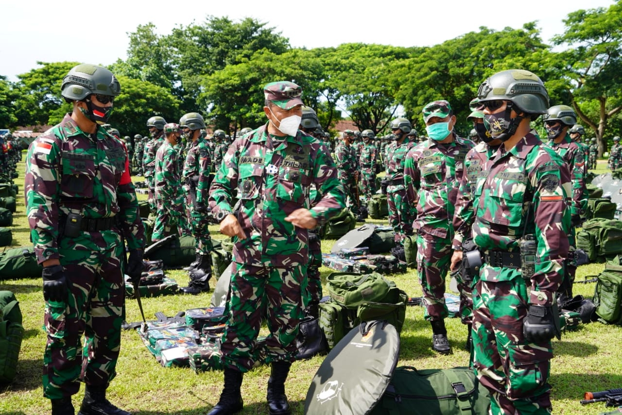 INAnews.co.id, Mataram – Kepala Staf Korem 162/WB Kolonel Arm I Made Karyawan mewakili Danrem 162/WB melaksanakan apel pemeriksaan kesiapan operasi satuan tugas pengamanan perbatasan (Satgas Pamtas) RI-RDTL Yonif 742/ SWY di lapangan Trisula Yonif 742 Gebang Mataram, Kamis (4/1/2021).