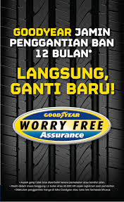 Ketika ban Goodyear yang Anda beli di Medan, mengalami kerusakan di Jakarta karena kondisi pemakaian atau faktor lain dijalan. Segera kunjungi toko Goodyear terdekat, tunjukkan kartu Worry Free Assurance dan minta penggantiannya secara gratis. Biaya pasang dan penyelerasan ditanggung pengguna.