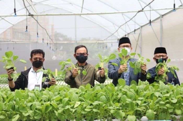 Mentan SYL bersama Walikota Bogor, Bima Arya Sugiarto, Anggota DPR RI Daerah Pemilihan Kota Bogor, Ecky Awal Mucharam, dan Pimpinan Ponpes Al Ghazaly, KH Mustofa Abdullah, melakukan panen Bayam yang dikembangkan dengan sistem hidroponik.