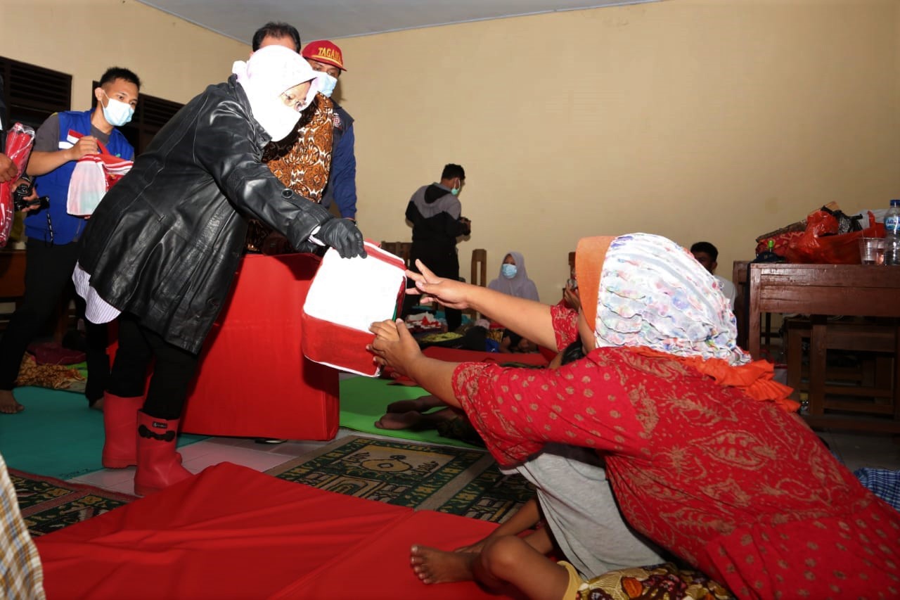 Bersama rombongan, Menteri Sosial Tri Rismaharini menyapa para pengungsi dan membagikan bantuan logistik seperti selimut, karpet, dan makanan untuk untuk balita. “Ini selimutnya bu. Semoga air segera surut dan bisa kembali ke rumah,” kata Mensos di Posko Pengungsi SD Muhammadiyah 01, Pencongan, Kelurahan Bener, Kecamatan Wiradesa, Kabupaten Pekalongan (12/02/2021).