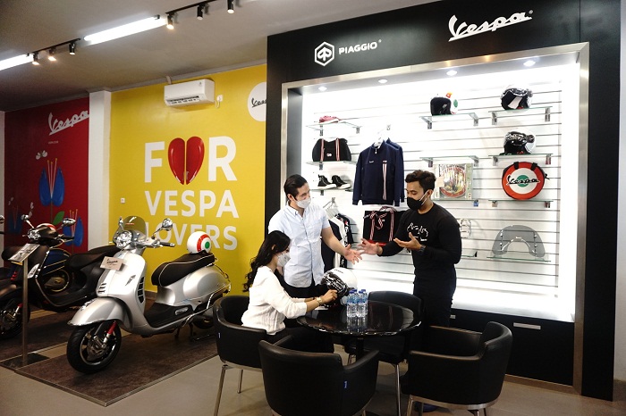 Untuk lebih menyesuaikan dan benar-benar mengadopsi kebanggaan Italia dan gaya hidup premium, baik skuter dan motorbike, ada area yang didedikasikan secara khusus untuk pilihan aksesori dan merchandise premium yang dapat memberikan inspirasi sentuhan akhir dalam menyempurnakan tampilan customer dari brand gaya hidup premium.
