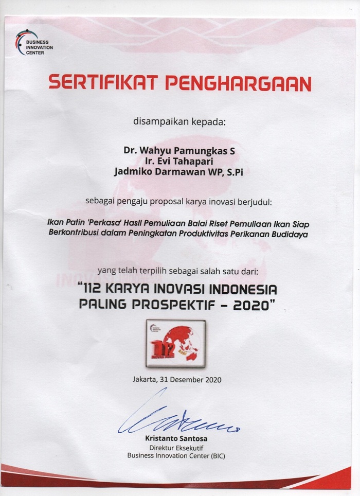INAnews.co.id, Jakarta – Hasil riset dan inovasi Badan Riset dan Sumber Daya Manusia Kelautan dan Perikanan (BRSDM) melalui Balai Riset Pemuliaan Ikan (BRPI) Sukamandi, Subang, Jawa Barat, terpilih sebagai salah satu dari 112 Karya Inovasi Indonesia Paling Prospektif – 2020, yang ditetapkan pada Februari 2021, oleh Business Innovation Center (BIC), yang didirikan oleh Kementerian Negara Riset dan Teknologi Republik Indonesia.
