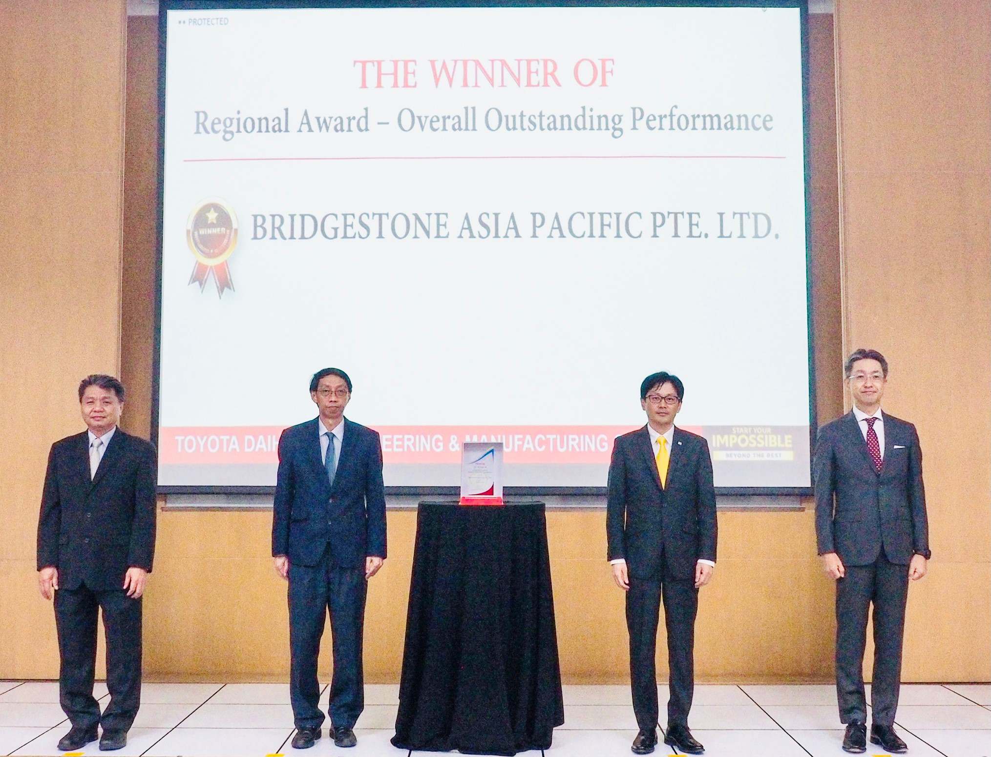 Bridgestone dapat meraih penghargaan paling bergengsi pada kategori Overall Outstanding Performance dalam skala Regional karena dapat menunjukkan dukungan yang kuat terhadap aktivitas Toyota di seluruh wilayah melalui jaringan penjualan, manufaktur, dan layanan yang luas di wilayah ASEAN.
