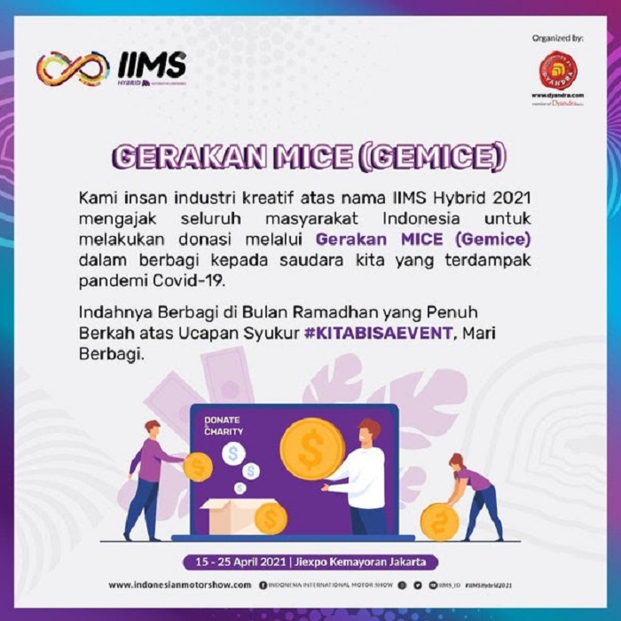 GEMICE sendiri ialah kampanye kreatif bersama komunitas pelaku dunia MICE melalui sosial media. Adapun GEMICE ini bertujuan untuk mengajak masyarakat Indonesia, menyuarakan dan melakukan program donasi pada penyelenggaraan IIMS Hybrid 2021. GEMICE mengajak seluruh pengunjung dan peserta pameran IIMS Hybrid 2021 baik itu pengunjung online di platform virtual atau offline di JIExpo Kemayoran untuk berdonasi membantu insan industri kreatif yang terdampak akibat pandemic Covid-19.