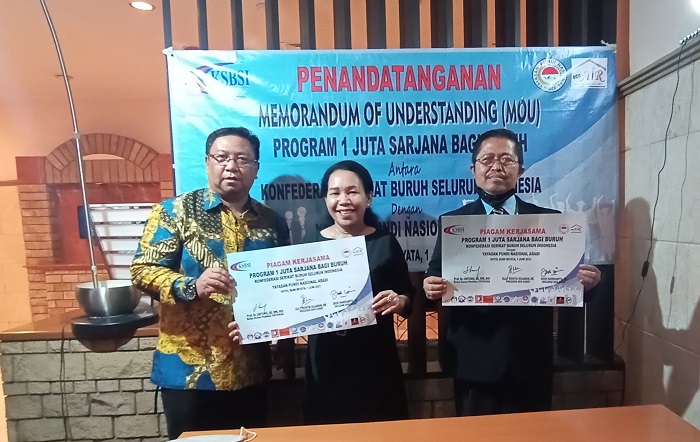 Penandatanganan kesepakatan kerjasama (MOu ) antara Konfederasi Serikat Buruh Seluruh Indonesia (KSBSI) dengan Yayasan Pundi Nasional Abadi (YAPUNASA) untuk program 1 juta sarjana bagi buruh. MOu ditandatangani oleh Presiden DEN KSBSI Elly Rosita Silaban dan Sekjen DEN KSBSI Dedi Hardianto serta Prof. Dr. Untung, SE.,MM.,Msi Selaku Ketua Dewan Pembina YAPUNASA.