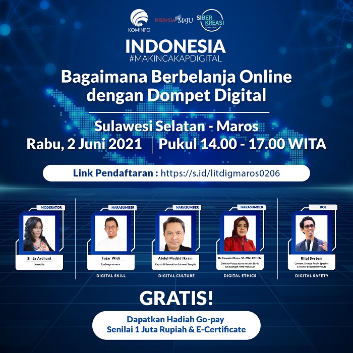INAnews.co.id, Maros – Siber Kreasi bersama Kementerian Komunikasi dan Informatika, kembali menggelar Seminar Literasi Digital yang dilakukan secara virtual. Webinar Literasi Digital diselenggarakan dengan topik ‘Bagaiman Berbelanja Onilne dengan Dompet Digital’, di Maros, Sulawesi Selatan. Kegiatan webinar ini dilaksanakan pada Rabu (2/6/2021) dimulai pukul 14.00 WITA, menghadirkan narasumber Fajar Widi selaku Enterpreneur, Abdul Madjid Ikram selaku Kepala Perwakilan Sulawesi Tengah, Dr.Rosnaini Daga,.SE,.MM,.CPHCM selaku Direktur Pascasarjana Institut Bisnis dan Keuangan Nitro Makassa dan Rijal System sebagai key opinion leader (KOL). Kegiatan Literasi Digtal ini dihadiri sebanyak 149 peserta dari berbagai kalangan.