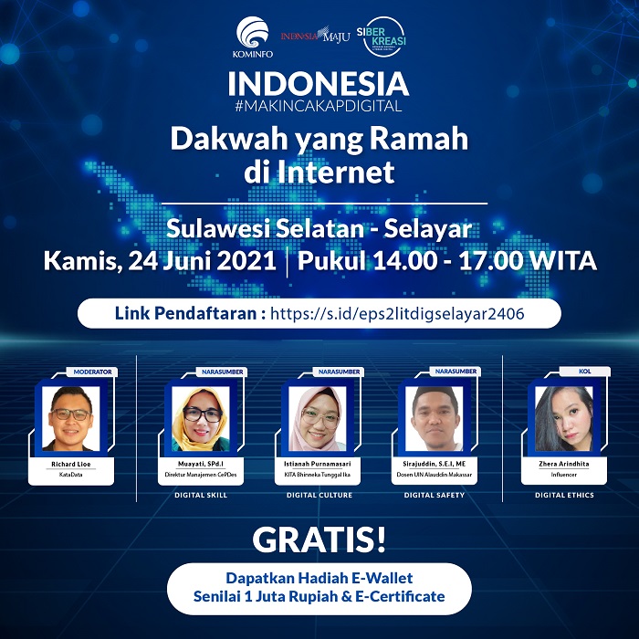 INAnews.co.id, Selayar – Rangkaian Program Literasi Digital “Indonesia Makin Cakap Digital” di Sulawesi, yang diselenggarakan oleh Kementerian Komunikasi dan Informatika Republik Indonesia dan Siberkreasi bersama Dyandra Promosindo, dilaksanakan secara virtual pada Kamis (24/6/2021) di Selayar, Sulawesi Selatan. Kolaborasi ketiga lembaga ini dikhususkan pada penyelenggaraan Program Literasi Digital di wilayah Sulawesi. Adapun tema kali adalah “Dakwah yang Ramah di Internet”.