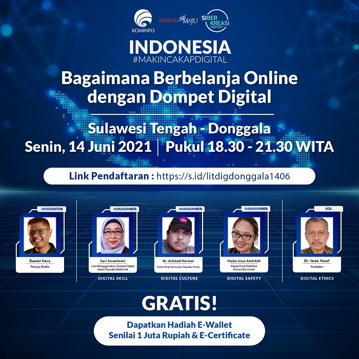 INAnews.co.id, Donggala – Kementerian Komunikasi dan Informatika Republik Indonesia bekerja sama dengan gerakan nasional literasi digital Siber Kreasi mengadakan sesi webinar ‘Indonesia Makin Cakap Digital’ di Sulawesi.Webinar dilaksanakan secara virtual pada Senen (14/6/2021) Kali ini giliran masyarakat Donggala yang berkesempatan mengikuti webinar bertajuk ‘Aman dan Nyaman dalam Bermedia Sosial’.