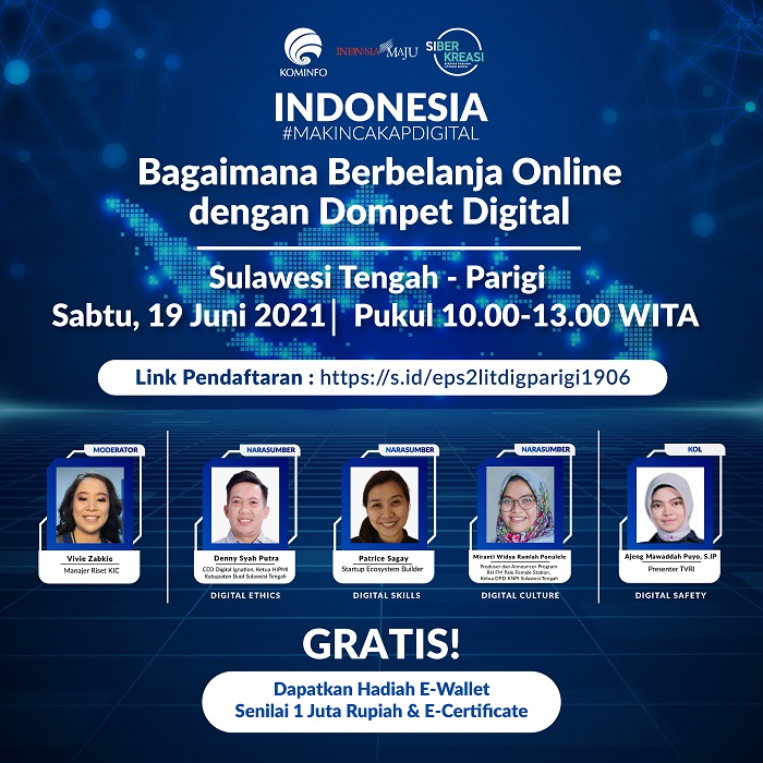 INAnews.co.id, Parigi – Rangkaian Program Literasi Digital “Indonesia Makin Cakap Digital” di Sulawesi, yang diselenggarakan oleh Kementerian Komunikasi dan Informatika Republik Indonesia dan Siber kreasi bersama Dyandra Promosindo, dilaksanakan secara virtual pada Sabtu (19/6/2021) di Parigi Moutong, Sulawesi Tengah. Kolaborasi ketiga lembaga ini dikhususkan pada penyelenggaraan Program Literasi Digital di wilayah Sulawesi. Adapun tema kali adalah “Bagaimana Berbelanja Online dengan Dompet Digital”. Pada episode kali ini diikuti oleh 220 peserta.