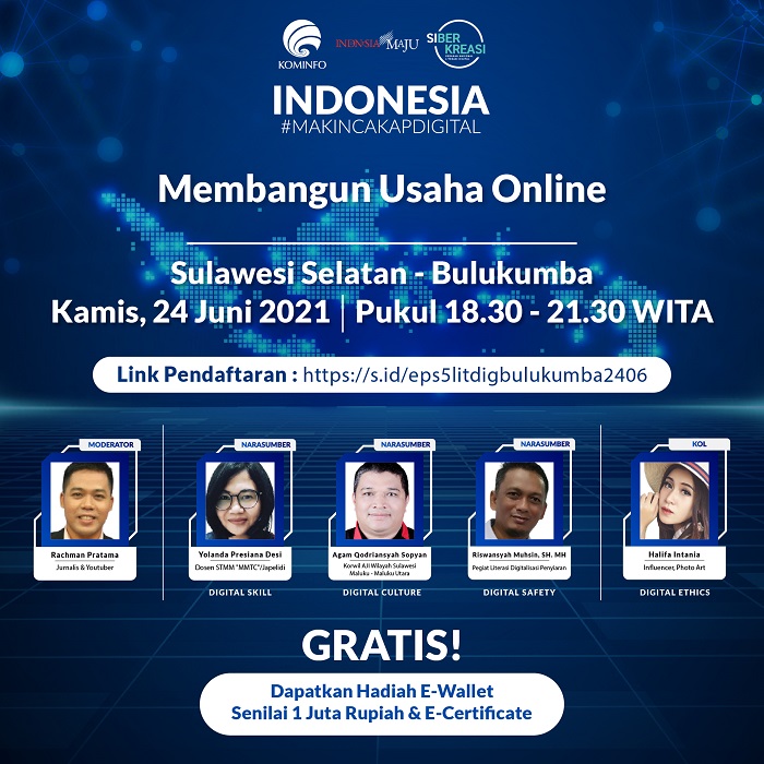 INAnews.co.id, Bulukumba – Rangkaian Program Literasi Digital “Indonesia Makin Cakap Digital” di Sulawesi, yang diselenggarakan oleh Kementerian Komunikasi dan Informatika Republik Indonesia dan Siberkreasi bersama Dyandra Promosindo, dilaksanakan secara virtual pada Kamis (24/6/2021) di Bulukumba, Sulawesi Selatan. Kolaborasi ketiga lembaga ini dikhususkan pada penyelenggaraan Program Literasi Digital di wilayah Sulawesi. Adapun tema kali adalah “Membangun Usaha Online”. Kegiatan ini diikuti oleh 398 peserta dari berbagai kalangan.