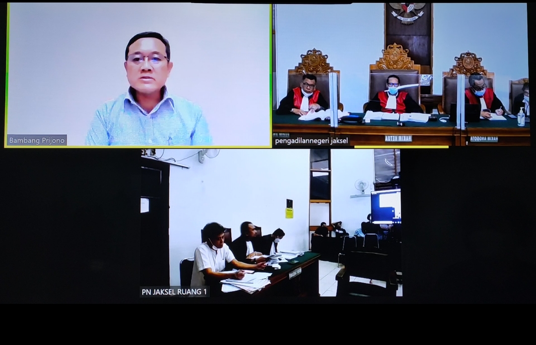 Persidangan perkara Arwan Koty dengan perkara nomor 1114/pid.B/2020/PN JKT. , nampak Bambang Prijono hadir dalam saksi persdiangan secara teleconfrence pada Rabu 2 juni 2021, di PN Jakarta selatan (foto : INAnews)