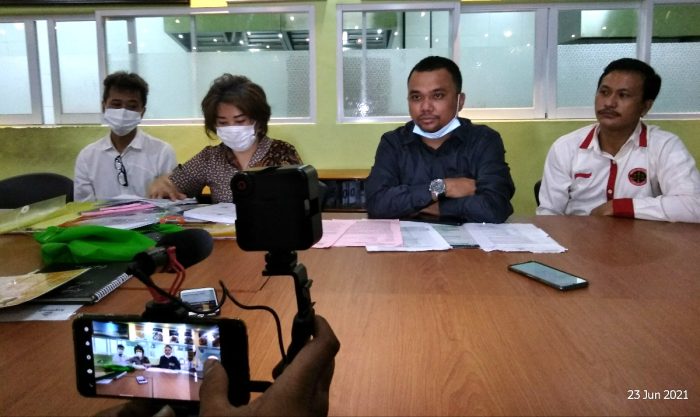Arwan Koty, Fini Fong , Kuasa Hukum Arwan Koty Aristoteles MJ Siahaan, Ependi Matias Sidabariba (kiri-kanan) saat memberikan keterangan pers pada Rabu 23 juni 2021 (foto ; INAnews)