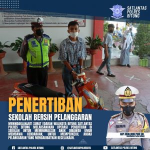 INAnews.co.id Bitung– Satuan Lalu Lintas Polres Bitung menggelar sosialisasi terkait edaran Wali Kota Bitung, tentang Kepeloporan Aparatur Sipil Negara (ASN) di Lingkungan Pemerintah Kota Bitung Dalam Pembangunan Karakter Anak dan Antisipasi Aktifitas Berbahaya Anak Usia Sekolah. Yang bertempat di Sekolah SMA Negeri 1 Bitung, 10 Juni 2021.