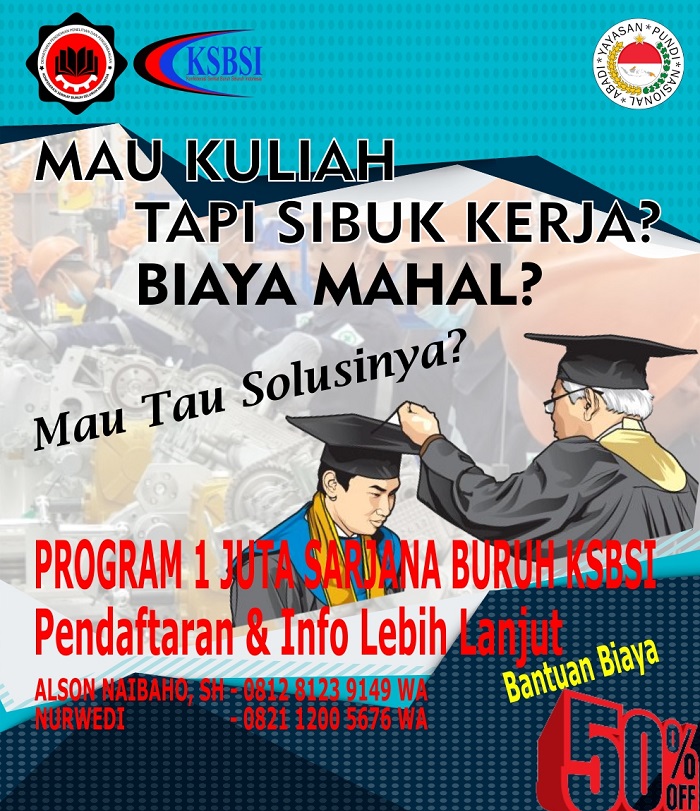 INAnews.co.id, Jakarta – Kabar gembira, Konfederasi Serikat Buruh Seluruh Indonesia (KSBSI) membuka peluang seluas-luasnya kepada para buruh dan pekerja yang tergabung dalam KSBSI untuk melanjutkan jenjang pendidikan ke bangku kuliah melalui program 1 juta sarjana bagi buruh.Dalam program yang digagas oleh KSBSI ini,para buruh dan pekerja akan mendapat fasilitas berupa potongan biaya kuliah sampai dengan 50%.
