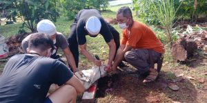 ” Untuk pemotongan hewan qurban, yang bisa masuk ke area pemotongan hanya panitia qurban. Sebelum pemotongan hewan qurban, sudah kita sosialisasikan/sampaikan kepada warga, tidak perlu datang ke area pemotongan karena pembagian daging qurban akan kita salurkan secara door to door, “jelas Ketua RW.