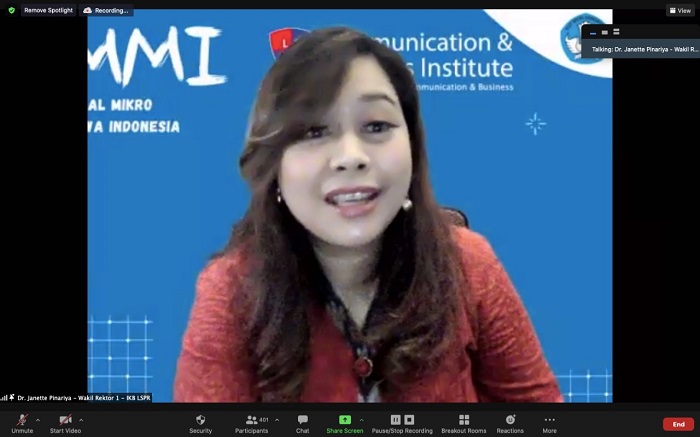 “Perbedaan budaya bukanlah menjadi penghalang untuk menimba ilmu, karena semua orang berhak menimba ilmu untuk mensejahterakan Indonesia. Jadikanlah setiap orang untuk menjadi guru dan setiap rumah menjadi sekolah. Semoga program KMMI LSPR 2021 banyak menciptakan lulusan yang kompeten dan siap bersaing,” ujar Dr. Janette M. Pinariya, M.M., Wakil Rektor I LSPR selaku Penanggung jawab program KMMI LSPR, ketika memberikan sambutan dalam acara Pembukaan Program Kredensial Mikro Mahasiswa Indonesia (KMMI) pada Kamis, 19 Agustus 2021.