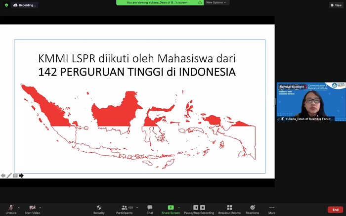 “Perbedaan budaya bukanlah menjadi penghalang untuk menimba ilmu, karena semua orang berhak menimba ilmu untuk mensejahterakan Indonesia. Jadikanlah setiap orang untuk menjadi guru dan setiap rumah menjadi sekolah. Semoga program KMMI LSPR 2021 banyak menciptakan lulusan yang kompeten dan siap bersaing,” ujar Dr. Janette M. Pinariya, M.M., Wakil Rektor I LSPR selaku Penanggung jawab program KMMI LSPR, ketika memberikan sambutan dalam acara Pembukaan Program Kredensial Mikro Mahasiswa Indonesia (KMMI) pada Kamis, 19 Agustus 2021.