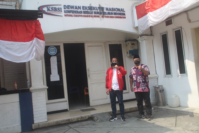 Pertemuan silahturahmi August Hamonangan bersama rombongan ke kantor pusat konfederasi serikat buruh seluruh Indonesia (KSBSI) tetap menjalankan protokol kesehatan dengan menggunakan Doble masker dan menjaga jarak serta mencuci tangan dengan hand sanitizer.
