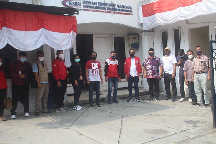 August Hamonangan disambut hangat oleh Sekjend DEN KSBSI, Dedi Hardianto.
